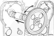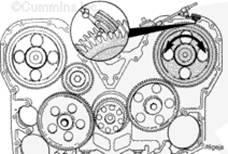 三個惰輪、兩個凸輪軸齒輪和曲軸齒輪都帶有裝配時用于對正的標(biāo)記。未正確對準(zhǔn)會造成發(fā)動機(jī)嚴(yán)重?fù)p壞。