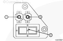 康明斯電子控制船用發(fā)動(dòng)機(jī)配備了 2 個(gè)斷路器,位于發(fā)動(dòng)機(jī)的 ECM 側(cè)。5 安斷路器 (1) 用于鑰匙開關(guān)控制的 ECM 電源,10 安斷路器 (2) 用于非鑰匙開關(guān)控制的面板電源。電路斷路器板上還安裝有 40-針 OEM 接頭(3)。