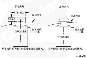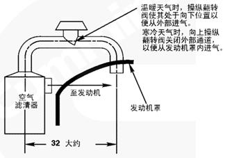 C [10°F] 時(shí),按照?qǐng)D 9 或 10 的進(jìn)氣設(shè)計(jì),從發(fā)動(dòng)機(jī)罩下吸進(jìn)空氣,以防止空氣濾清器堵塞。