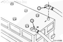 警告 蓄電池可能會有易爆性氣體逸出。為了盡可能避免人身傷害,在維護(hù)蓄電池前,必須保持發(fā)動機(jī)艙通風(fēng)良好。為避免產(chǎn)生電弧,應(yīng)最先拆下并最后連接蓄電池負(fù)極 (-) 電纜。 |