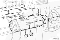 L10/M11/N14 整體式 PRELUB™ 起動馬達(dá),拆卸起動馬達(dá) (1) 的電氣接頭 (3), 并標(biāo)識它們的位置。拆下 3 顆螺栓 (2) 和現(xiàn)有的起動馬達(dá) (1)。保留螺栓。