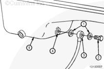 把一個銅密封墊圈 (1) 放在空心螺栓上 (2)。把空心螺栓插到空心管接頭內(nèi) (3)。將其他銅密封墊圈 (1) 放到空心螺栓/空心管接頭總成中。將空心螺栓/空心管接頭總成插入到油底殼 (5) 的回油側(cè) (4)。扭矩值: 88 n.m [65 ft-lb]