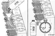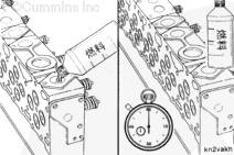 測試缸蓋是否損壞。將缸蓋放下,使排氣口朝上。向一個(gè)排氣端口灌入燃油,直到注滿為止。啟動定時(shí)器。
