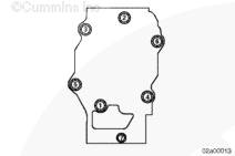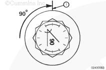 一個(gè)缸蓋上的所有螺栓(1 到 6 號)都擰緊到 217 N•m [160 ft-lb] 后,必須將這些螺栓沿?cái)Q緊的方向再轉(zhuǎn) 90 度。將螺栓擰緊至 217 N•m [160 ft-lb] 后,在缸蓋和 12 角螺栓頭上做標(biāo)記,以便為額外的轉(zhuǎn)動提供參考點(diǎn)。轉(zhuǎn)動螺栓,直到缸蓋上的指示標(biāo)記在第三和第四角頭之間。