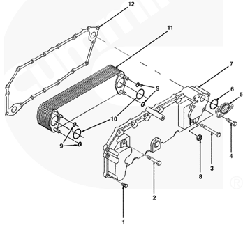 1六角頭螺栓 - 12 - M10 x 1.50 x 30,2六角頭螺栓 - 6 - M10 x 1.50 x 75,3六角頭螺栓 - 1 - M10 x 1.50 x 65,4六角頭螺栓 - 1 - M10 x 1.50 x 20,5蓋板 – 1,6 O 形密封圈 – 1,7機(jī)油冷卻器蓋 – 1,8六角凸緣螺母 – 4,9機(jī)油冷卻器雙頭螺柱 O 形密封圈 – 4,10機(jī)油道 O 形密封圈 – 2,11冷卻器芯 – 1,12機(jī)油冷卻器蓋密封墊 - 1。
