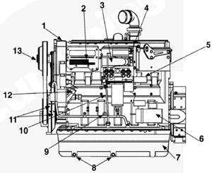 1齒輪室,2發(fā)動機銘牌,3進氣,4燃油泵,5燃油濾清器,6起動馬達,7油底殼,8放油口,9曲軸正時觸針端口,10機油尺,11減振器,12機油加注口/盤車裝置,13風(fēng)扇輪轂。