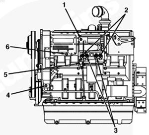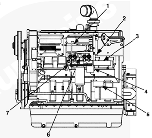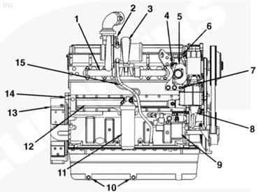 1排氣歧管,2渦輪增壓器機油進口,3渦輪增壓器,4節(jié)溫器殼通風(fēng)口,5節(jié)溫器殼,6發(fā)動機冷卻液出口,7冷卻液溫度傳感器,8水泵,9冷卻液濾清器,10發(fā)動機放油口,11組合式全流/旁通機油濾清器,12機油冷卻器,13飛輪殼,14發(fā)動機生產(chǎn)序號(ESN),15渦輪增壓器機油回油口。