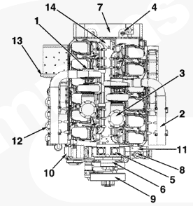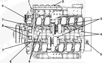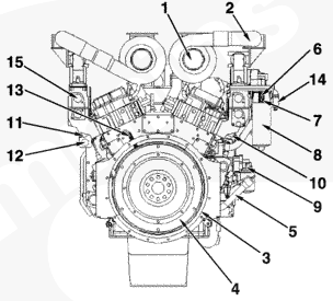 1渦輪增壓器進(jìn)口接頭,2 ATA 跨接接頭,3排氣口接頭,4發(fā)動(dòng)機(jī)轉(zhuǎn)速傳感器,5冷卻液出口接頭,6前吊耳,7飛輪殼,8曲軸箱通風(fēng)裝置,9風(fēng)扇輪轂,10充電機(jī),11冷卻液液位開關(guān)接頭,12組合式機(jī)油濾清器,13燃油進(jìn)口管接頭,14后吊耳。