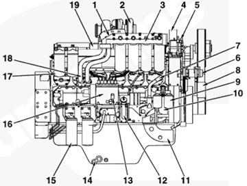 1空氣跨接殼體,2渦輪增壓器,3全流式機(jī)油濾清器,4出水口接頭,5吊耳,6風(fēng)扇皮帶惰輪總成,7水旁通管,8風(fēng)扇皮帶惰輪皮帶輪,9水濾器,10水泵,11進(jìn)水口接頭,12機(jī)油加注管,13輸油泵,14放油口,15燃油濾清器,16燃油泵,17機(jī)油旁通濾清器,18機(jī)油輸送管,19進(jìn)氣歧管。