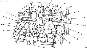 1渦輪增壓器冷卻液供應(yīng)管,2中冷器進水口溫度傳感器,3冷卻液排氣管連接式中冷器,4發(fā)動機出水管接頭,5 LTA出水管接頭,6中冷器排氣管連接式發(fā)動機,7搖臂室蓋,8渦輪增壓器機油供油管,9排氣歧管,10渦輪增壓器。