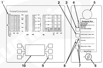 1數(shù)字 VAC 儀表板,2面板指示燈/指示燈測試按鈕,3故障確認按鈕,4遠程起動、非自動、停機、警告狀態(tài),5緊急停機按鈕,6 0/手動/自動開關(guān),7手動運行/停機按鈕指示燈,8運行按鈕指示燈,9顯示菜單選擇按鈕(6 個之中的 1 個),10圖形顯示器。