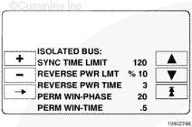 容許窗口時(shí)間 (PERM WIN-TIME):調(diào)整在 PowerCommand® 控制系統(tǒng)發(fā)出斷路器閉合信號(hào)前發(fā)電機(jī)組必須與系統(tǒng)母線保持同步的時(shí)間期限(單位:秒)。可調(diào)整的范圍是 0.5 至 5 秒。對(duì)于隔離母線的建議值是 0.5 秒。(將控制系統(tǒng)調(diào)整為更小的同步檢查窗口或更長(zhǎng)的延時(shí)會(huì)造成同步時(shí)間延長(zhǎng)。)
