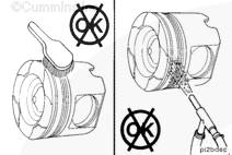 不要使用金屬刷。金屬刷會(huì)損壞活塞環(huán)槽。不要用玻璃噴丸清潔活塞環(huán)槽??墒褂昧慵?hào)為3822735的胡桃殼或塑料噴丸對(duì)活塞環(huán)槽和活塞頂進(jìn)行噴丸處理。用最小的有效壓力,并且不要長(zhǎng)時(shí)間集中噴射一個(gè)區(qū)域。塑料噴丸的推薦工作壓力是276 kPa [40 psi]。