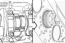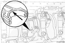 安裝連桿時(shí),使連桿的倒角朝向曲軸連桿軸頸的圓角。如果連桿裝反,可能會(huì)損壞曲軸。