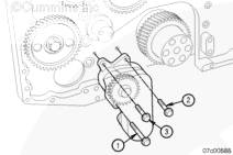 注: 檢查 O 形圈有無刻痕或切口,確保 O 形圈在凹槽中沒有扭曲。使用 Lubriplate™ 105 馬達組裝潤滑脂或等同物潤滑 O 形圈和機油泵凹槽。將一個 O 形圈安裝到機油泵的凹槽中。潤滑脂將使 O 形圈固定在凹槽中。將機油泵安裝到缸體上。將一個長螺栓 (1) 和兩個短螺栓(2、3)安裝到機油泵中。擰緊所有螺栓。