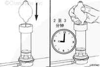 將橡皮球尖端插入測試儀的頂部孔中,擠壓橡皮球 2 到 3 分鐘,通過測試液吸出散熱器中的空氣。
