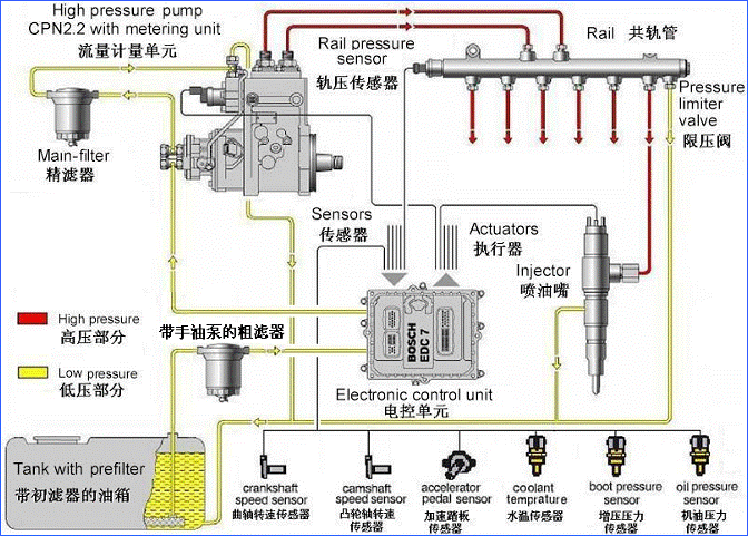 Ø 接線故障為:線束由于振動、磨損等原因,連接斷開或直接搭在缸蓋上與地短接。ECU會報錯。 3.1 噴油器出現(xiàn)故障 Ø 怠速不穩(wěn),聽柴油機聲音異常 Ø 利用斷缸法或高壓油管觸感法判斷 Ø 利用故障診斷儀做加速測試判斷 3.2 水溫、機油溫、進氣溫度過高 Ø 水溫、機油溫、進氣溫度過高時,ECU會進入過熱保護功能,限制發(fā)動機功率。造成水溫高的原因及排除方法 ①水箱水面過低:檢查有無漏水處,加水 ②風扇轉(zhuǎn)速過慢或不轉(zhuǎn):檢查風扇傳動部件 ③水箱堵塞:檢查水箱,清理或修復 ④水泵皮帶松弛:按規(guī)定調(diào)整張緊力 ⑤水泵墊片損壞,水泵葉輪磨損:檢查并修復或更換 ⑥節(jié)溫器故障:更換 ⑦水管密封件損壞,漏入空氣:檢查水管、接頭、墊 片等,更換損壞件 Ø 在排除故障之前,首先要排除傳感器及儀表的反映失真情況 Ø 機油溫過高的原因及排除方法 ①油底殼油面低或缺油:檢查油面及漏油處,修復并加油 ②水溫高:檢查上述造成水溫高的原因并排除之 ③機油冷卻器流通不暢:檢查并清理 Ø 進氣溫度過高的原因及排除方法 檢查中冷器的散熱能力 3.3 同步信號出錯 出現(xiàn)該問題時,一般是一個傳感器的信號失效??梢圆榭撮W碼表查找具體原因 排除方法同1.4 3.4 流量計量單元故障 流量計量單元是控制軌壓的執(zhí)行機構(gòu),安裝在高壓油泵上,它出現(xiàn)問題以后,高壓油泵會以最大的能力向共軌管供油,此時共軌管上的泄壓閥一般會打開,柴油機會有“咔咔”的噪音。軌壓傳感器出現(xiàn)問題也會有類似的現(xiàn)象。 Ø 排除方法:檢修線路,確認是流量計量單元或軌壓傳感器故障,通知辦事處處理 3.6 傳感器故障 進氣壓力傳感器是ECU用來估算進氣量的傳感器(安裝在進氣管上),水溫傳感器是用來判斷發(fā)動機熱負荷的傳感器(安裝在出水管上),軌壓傳感器是用來檢測共軌管的燃油壓力(安裝在共軌管上) Ø 排除方法: 檢查進氣溫度壓力、水溫、軌壓傳感器,看接插件是否牢靠 注:出現(xiàn)3.1、3.3、3.4、3.5、3.6時,柴油機進入“跛行回家”模式。 故障四:發(fā)動機始終運行在1000轉(zhuǎn) 此時油門失效:ECU通過踏板電位計給出的信號來判斷負荷,當踏板出故障時,出于安全考慮,ECU會控制柴油機會自動回到1000轉(zhuǎn)的怠速。 Ø 電子油門踏線松脫或接錯,重新拔插或檢查油門接線是否正確,重新接線 Ø 電子油門接插件進水,用工具把接插件吹干再起動 注意:更換油門時,需要同一型號的油門。 故障五:柴油機怠速游車 柴油機游車的原因及排除方法: ①噴油器工作不正常:檢查各缸噴油器及線束 ②具有車速傳感器的整車,停車時有車速信號 輸入:檢查車速表及車速傳感器信號及接線 ③燃油質(zhì)量差含水或蠟質(zhì):清洗燃油系統(tǒng),更換燃油濾清器 ④燃油低壓油路漏入空氣:檢查油管及接頭密封性,排除空氣 ⑤噴油嘴霧化不穩(wěn)定:檢查并修復 注:①由于水溫低引起的怠速上升是ECU正常的功能 ②有其他負載時(如打開空調(diào)),怠速會自然提升100轉(zhuǎn) 說明 Ø 濰柴動力國三系列柴油機采用Bosch公司的第二代高壓共軌系統(tǒng)。高壓共軌系統(tǒng)對油路(包括低壓油路和高壓油路)要求較高,很多問題都是由油路問題引起的 Ø 整車線束問題也是主要的故障源出現(xiàn)故障時,應(yīng)先考慮此