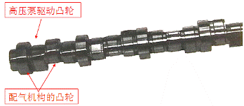 凸輪軸上既有配氣機(jī)構(gòu)的凸輪,同時(shí)兼有高壓泵驅(qū)動(dòng)凸輪。