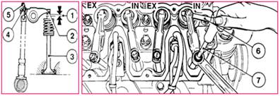 調(diào)整氣門間隙之前,停機(jī)30分鐘,油溫要低于80℃。用塞尺6檢查2、3之間的間隙1,塞尺塞入后要有輕度 磨擦,正確的氣門間隙;進(jìn)氣門:0.3mm,排氣門:0.5mm,(每次更換氣缸墊后,氣門間隙增加0.1mm,運(yùn)轉(zhuǎn) 50-150小時(shí)后重新調(diào)整)。按如下步驟調(diào)整氣門間隙: -松開(kāi)鎖母4。用改錐7擰螺栓5,上緊鎖母4,得到正確的氣門間隙。 檢查、調(diào)查其他各缸的氣門間隙。裝好氣門室蓋(如需要,更換墊圈)。