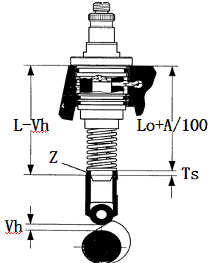 x+y: 缸體中安裝平面到挺柱的高度與標準高度之差。墊片厚度Ts的計算公式 Ts=(L-Vh)-(Lo+A/100) 缸體中安裝平面到挺柱的高度與標準高度Le之差。L值即為L=Le+x+y。只更換高壓泵,需知道提前角和A值,根據(jù)公式即可得出墊片厚度Ts。Ts=Ek-(Lo+A/100)確定與噴油泵正時相對應(缸)的活塞上止點;