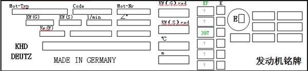 • 1、發(fā)動機型號;3、發(fā)動機順序號;4、額定功率;6、額定轉(zhuǎn)速;7、噴油角;16、EP值;