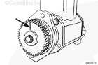 當(dāng)從齒輪端看壓縮機(壓縮機處于垂直位置)時,轉(zhuǎn)動齒輪使“l(fā)”正時標(biāo)記處在 3 點位置。Cummins® 單缸空氣壓縮機在殼體上的 3 點鐘位置有一個小片,可以幫助設(shè)定壓縮機的正時。一旦正時標(biāo)記處于 3 點的位置,這會將壓縮機設(shè)定為壓縮機壓縮沖程上止點前 60 度。