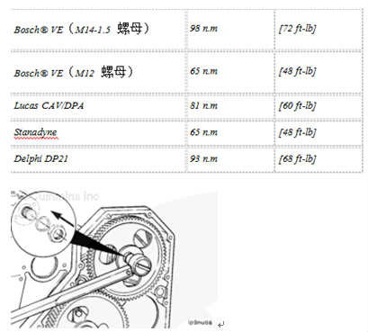 如果無 劃線標(biāo)記時(shí)安裝新的或大修好的噴油泵,以驅(qū)動(dòng)軸旋轉(zhuǎn)反向轉(zhuǎn)動(dòng)噴油泵來占據(jù)齒隙。擰緊法蘭安裝螺母。