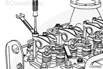 將康明斯發(fā)動機塞尺插入跨接壓板和搖臂承座之間來測量間隙。如果間隙測量值超出技術規(guī)范,則松開鎖緊螺母,調整間隙至標稱的技術規(guī)范。