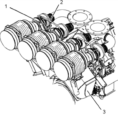 Perkins4016柴油發(fā)動機在發(fā)動機后端安裝了四個渦輪增壓器(1)。每個渦輪增壓囂的渦輪機側(cè)都連接至該渦輪增壓器的排氣歧管。每個渦輪增壓器的壓縮機側(cè)都通過管道與后冷器殼體相連。