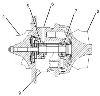 渦輪增壓器中的軸承(5)和軸承(7)使用發(fā)動機機油進行壓力潤滑。機油經(jīng)由進油管被輸送到上部的進油口(6)。機油繼而經(jīng)由中段內(nèi)的油遁潤荷軸承。機油從底部的出油口(9)流出。然后機油通過回油管流回曲軸箱。