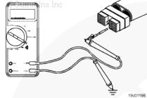 調(diào)整萬用表以便測量電阻。將測試導(dǎo)線插入 OEM 線束接頭的巡航控制 ON/OFF 開關(guān)輸入觸針,然后將其連接到萬用表表筆上。從鱷魚夾上拆下另一根萬用表表筆,然后將其接觸康明斯ISF3.8 CM2220發(fā)動機(jī)缸體接地。