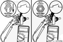 萬用表的一支表筆接觸開關(guān)的 SET/COAST(設(shè)置/滑行)端子。用萬用表的另一支表筆接觸底盤接地端。將該開關(guān)撥到 RESUME/ACCEL(恢復(fù)/加速)位置,然后再到 SET/COAST(設(shè)置/滑行)位置。測量電阻。