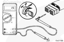萬用表的一支表筆接觸開關(guān)的 RESUME/ACCEL(恢復(fù)/加速)端子。另一支表筆接觸底盤接地將該開關(guān)撥到 SET/COAST(設(shè)置/滑行)位置,然后再到 RESUME/ACCEL(恢復(fù)/加速)位置。測量電阻。