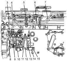 7將支架(14)定位到Perkins1106A/C發(fā)動(dòng)機(jī)缸體和噴油泵上。將螺栓(15)安裝到Perkins1106A/C發(fā)動(dòng)機(jī)缸體上并用手?jǐn)Q緊。