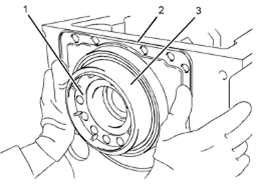 4.對齊塑料套管(3)與Perkins1106A/C發(fā)動機(jī)曲軸法蘭(1)。確保塑料套管在Perkins1106A/C發(fā)動機(jī)曲軸法蘭上嚙合。將新Perkins1106A/C發(fā)動機(jī)曲軸后油封(2)的四角推到Perkins1106A/C發(fā)動機(jī)曲軸法蘭上。在這個操作過程中,會把塑料套管壓出Perkins1106A/C發(fā)動機(jī)曲軸后油封。棄置塑料套管。