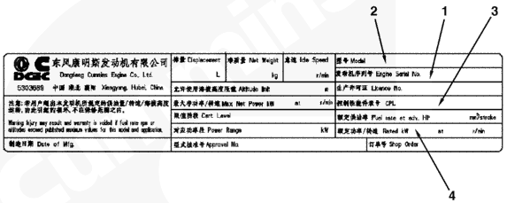 發(fā)動(dòng)機(jī)銘牌顯示有關(guān)發(fā)動(dòng)機(jī)的重要信息。發(fā)動(dòng)機(jī)生產(chǎn)序號(hào) (ESN) 和控制零件目錄 (CPL) 提供了服務(wù)和訂購(gòu)零件所需信息。未經(jīng)康明斯公司批準(zhǔn)不得擅自變更發(fā)動(dòng)機(jī)銘牌。