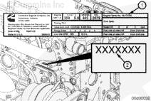 注: 如果發(fā)動(dòng)機(jī)銘牌 (1) 不清晰,可以在發(fā)動(dòng)機(jī)缸體上的機(jī)油冷卻器殼體頂部找到發(fā)動(dòng)機(jī)生產(chǎn)序號(hào) (2)。附加發(fā)動(dòng)機(jī)信息可以在電子控制模塊 (ECM) 銘牌上找到。