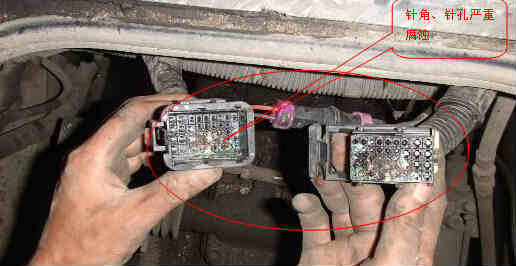 檢查水溫傳感器接插件,清除故障碼后冷卻水溫信號超高限故障不再出現(xiàn),但是用檢測儀檢測到故障碼:“256指示燈1驅(qū)動線路故障”頻繁出現(xiàn),玉柴電噴柴油發(fā)動機還是經(jīng)常自動熄火,檢查玉柴電噴柴油發(fā)動機線束,發(fā)現(xiàn)線束42接插件進水,針腳已嚴重腐蝕,見圖5,