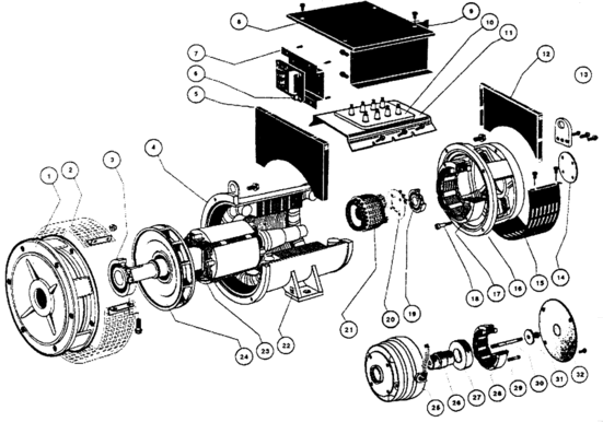 1—前端蓋;2—出風蓋板;3—軸承;4—定子;5—端子箱側(cè)板;6—電壓調(diào)節(jié)器;7—調(diào)節(jié)器支架;8—端子箱頂蓋;9—端子箱前后板;10—接線板;11—接線板支架;12—端子箱側(cè)板;13—吊攀;14—軸承蓋;15—進風蓋板;16—后端蓋;17—勵磁定子;18—勵磁定子固定螺栓;19—軸承;20—旋轉(zhuǎn)整流器;21—勵磁電樞;22—接地牌;23—轉(zhuǎn)子;24—風扇;25—永磁機機殼;26—永磁機轉(zhuǎn)軸;27—永磁機轉(zhuǎn)子;28—永磁機定子;29—永磁機定子固定螺栓;30—永磁機轉(zhuǎn)子固定螺栓;31—墊圈;32—永磁機蓋板