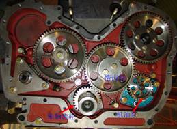 3、清洗 利用循環(huán)潤滑油沖洗零件表面,帶走由于零件磨損產(chǎn)生的金屬微粒和其它雜質(zhì)。 4、防銹 金屬零件表面上的潤滑油膜可以減少空氣、水分和燃燒氣體的腐蝕作用。 5、密封 活塞、活塞環(huán)和氣缸壁之間的潤滑油膜,可增強氣缸的密封性。 柴油發(fā)動機潤滑方式 柴油機中應(yīng)用到的潤滑方式有: 1、壓力潤滑 機油在機油泵的作用下以一定的壓力,通過專設(shè)的油道輸送至摩擦表面。 這種潤滑方式的特點:可靠、并有較強的冷卻和清洗作用,適用于相對速度較高負荷較重的摩擦表面,如曲軸主軸承、連桿軸承、凸輪軸軸承、搖臂軸承等。 2、飛濺潤滑 靠運動零件擊濺起來的機油油滴或油霧,直接落在摩擦表面或經(jīng)集油孔收集到摩擦表面進行潤滑。這種方式適用于速度較低、負荷較小的零件以及不易實現(xiàn)壓力潤滑的零件的潤滑,如氣缸內(nèi)壁、連桿小頭襯套、活塞銷座、配氣凸輪及挺柱等部位。 有的部位則同時采用以上兩種方式進行潤滑,如正時齒輪室。 這種采用多種方式進行潤滑的潤滑系統(tǒng)稱為綜合式潤滑系統(tǒng)。 潤滑脂潤滑 如水泵軸等輔助機構(gòu)的零件,由于負荷小,摩擦損失不大,采用定期加注潤滑脂的方式進行潤滑。 柴油發(fā)動機潤滑系的組成及油路 1、潤滑系的組成 柴油機采用的綜合式潤滑系統(tǒng)的組成部分主要有:貯油裝置、泵油裝置、濾清裝置、檢示裝置、安全裝置和散熱裝置等組成。 1、貯油裝置 即油底殼,其容量要満足潤滑系統(tǒng)工作時最大循環(huán)供油量的要求,但受結(jié)構(gòu)尺寸的限制,不可能做得太大。 2、泵油裝置 主要有機油泵、油管和集濾器等。機油泵通過油管將油底殼中的機油吸入、加壓并送往濾清裝置,使機油在發(fā)動機內(nèi)循環(huán)流動。 柴油機機油泵安裝在機體上的隧道孔內(nèi),通過惰齒輪帶動機油泵齒輪轉(zhuǎn)動。機油泵的吸油管和集濾器應(yīng)保持浸沒在油面下,以防止吸入空氣,影響潤滑系的正常工作。 3、濾清裝置 包括集濾器和機油濾清器,用來濾除機油中的各種雜質(zhì),保證潤滑油的清潔。 4、檢示裝置 包括機油壓力表和機油溫度表、機油標(biāo)尺等,用來指示潤滑系的工作狀況。 5、安全裝置 包括限壓閥、回油閥(調(diào)壓閥)和旁通閥(安全閥)。 限壓閥安裝在機油泵的出油道上(也叫機油泵限壓閥),用來限制系統(tǒng)的最高壓力,保證機油泵壓力既要克服濾清器及管路、油道的阻力,滿足機體主油道內(nèi)機油壓力的要求,又防止系統(tǒng)壓力過高而使油管破裂、密封件損壞,以及機油泵功率消耗增大。當(dāng)機油泵出口壓力超過規(guī)定值時,限壓閥開啟,使部分機油直接流回油底殼。 回油閥安裝在機油濾清器座中,其作用是使?jié)櫥到y(tǒng)保持穩(wěn)定的機油壓力,使機油能克服管路、油道的阻力,將機油送至各摩擦表面,保證潤滑可靠,但又要防止主油道壓力過高。當(dāng)主油道壓力超過規(guī)定值時,回油閥開啟,使多余的機油流回油底殼。 旁通閥也安裝在機油濾清器上(與濾芯并聯(lián))。當(dāng)機油濾清器被雜質(zhì)堵塞、油路不暢通時,在濾清器的前后油路間產(chǎn)生壓力差。當(dāng)此壓力差達到一定數(shù)值時,旁通閥開啟,使機油不經(jīng)過濾清器而直接流入主油道,以保證對發(fā)動機各部分的正常潤滑。 6、散熱裝置 包括機油散熱器及油管等。用于對機油進行強制冷卻,以保持機油在適宜的溫度范圍內(nèi)工作。 2、潤滑油路 機油經(jīng)過濾后通過機體內(nèi)的橫向油道進入曲軸的各主軸承和配氣凸輪軸軸承進行潤滑。主軸承的機油一部分經(jīng)曲軸中的斜向油道進入各連桿軸承,另一部分流回油底。其中第一主軸承還有一部分機油流向了齒輪室,并從齒輪室最終流向油底殼。從上述部位流出的機油又被高速運動的曲軸、連桿等零件擊濺到氣缸壁與活塞、配氣凸輪及挺柱、活塞銷、連桿小頭等部位,以潤滑這些機件。 進入凸輪軸第三軸承的部分機油經(jīng)機體和氣缸蓋中的垂直油道,再通過第三搖臂軸座(帶油孔)被送至配氣機構(gòu)的搖臂軸中心孔內(nèi),再沿徑向孔進入各搖臂襯套,然后再通過搖臂內(nèi)的油孔流向氣門和推桿。 進入第一主軸承的機油通過齒輪室上的空心螺栓,進入齒輪室潤滑油管,然后通過噴嘴噴向各齒輪,流下來的機油又通過齒輪的轉(zhuǎn)動再濺向各齒輪進行潤滑,取后流向油底殼。 此外,在主油道上還安裝有機油壓力表接頭,用來安裝機油壓力表指示主油道壓力。 柴油發(fā)動機潤滑系的主要機件 1、機油泵 機油泵的功用是提高機油壓力和保證一定的流量,向各摩擦表面強制供油,使發(fā)動機潤滑部位得到可靠的潤滑。 柴油機采用齒轉(zhuǎn)式機油泵。 在油泵殼體內(nèi)裝有主動齒輪和從動齒輪,齒輪與殼體內(nèi)壁之間的間隙很小,殼體上有進出油口。 柴油發(fā)動機機油泵的工作原理 機油泵工作時,齒輪按下頁圖中箭頭方向旋轉(zhuǎn),吸油腔的容積由于輪齒脫離嚙合而增大,腔內(nèi)產(chǎn)生一定的真空度,機油便從進油口被吸入齒腔。隨著主從動齒輪的旋轉(zhuǎn),機油在齒輪與泵體間被帶到壓油腔內(nèi)。由于在壓油腔一側(cè)輪齒進入嚙合,壓油腔容積減小,油壓升高,機油便經(jīng)出油口被送到機油道中。機油泵由齒輪室內(nèi)的惰齒輪