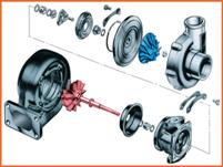 1.廢氣渦輪殼 2.“V”形箍帶 3.壓氣渦殼 4.軸承座 5.壓氣機葉輪 6.密封環(huán) 7.油封套 8.油封壓板 9.“O”密封圈 10.軸承墊 11.增壓器軸承 12.密封環(huán) 13.渦輪葉輪和軸 14.隔熱墊 15.隔墊板